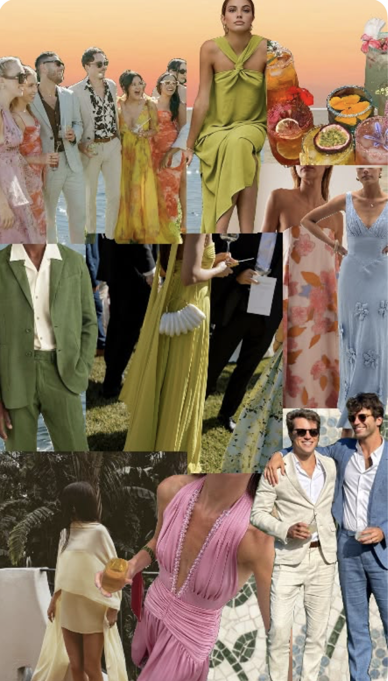 The inspiration photos below are just for fun — not rules, not requirements. Just a vibe. Think sunset colors. Light fabrics. Movement. Something you’d wear to a really beautiful dinner by the ocean. We cannot wait to see you all dressed up!